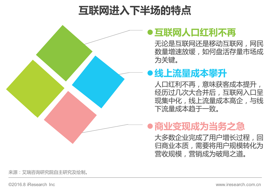 ?014qvQ资本驱动中国互联网企业q行了疯狂的补脓大战Q伴随而来的是l分行业内的合ƈ潮Q资本在l历投、管两个q程后,集中q来退出阶Dc资本对亏损的承受力来低Q依赖资本输血的业务,再难获得资本的持l投入,企业自n造血能力来重要。与此同Ӟ互联|和Ud互联|h口红利不再,互联|流量的基本面发生变化,U上和线下的量成本于一_整个行业亟待挖掘新的量?/P>