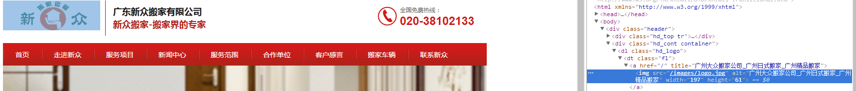 網站logo的alt標簽和title標簽都是調取的首頁TDK里面的標題部分,這個需要修改下因為標簽只能體現出一個關鍵詞來而不是幾個隨意填寫的,我們把alt標簽關鍵詞設置為廣州大眾搬家公司然后在加上logo的H1標簽注釋讓百度知道這個的重要性。