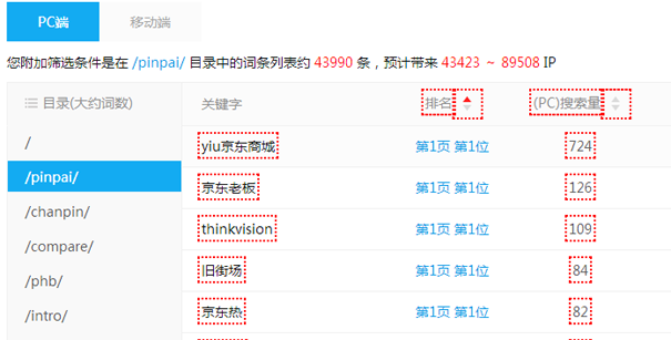 我們可以清晰的看到僅/pinpai/這個欄目頁,就創建了僅 4 萬條的關鍵詞排名,預估可以帶來4.3-8. 9 萬個IP。可見,有效的優化電商網站的分類頁面,從URL的角度給你帶來源源不斷的流量。