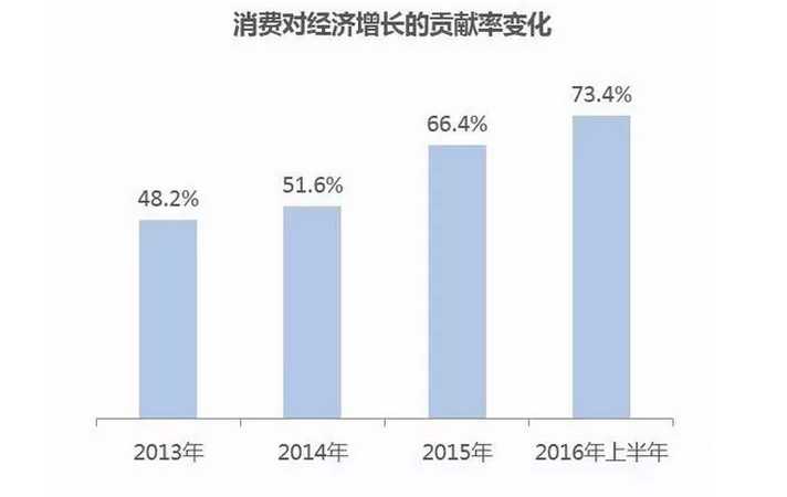 從 宏觀大環(huán)境來看,2016 年國(guó)民經(jīng)濟(jì)延續(xù) 2015 年的中高速增長(zhǎng),GDP 增速難以逾越 7% 大關(guān)。與此同時(shí),消費(fèi)占經(jīng)濟(jì)增長(zhǎng)的比率逐年提升,2016 年上半年達(dá)到 73.4%,成為經(jīng)濟(jì)增長(zhǎng)的重要引擎。在經(jīng)濟(jì)進(jìn)入中高速增長(zhǎng)的新常態(tài)下,供給側(cè)改革創(chuàng)新與居民消費(fèi)升級(jí)的趨勢(shì)顯現(xiàn)。