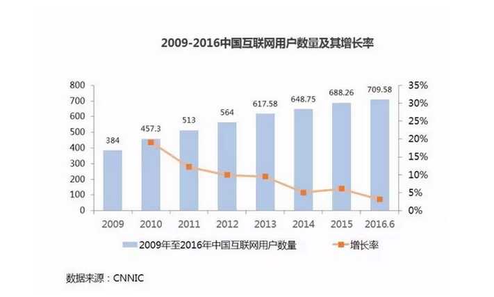 互聯(lián)網(wǎng)行業(yè)在推動(dòng)供給側(cè)改革創(chuàng)新與居民消費(fèi)升級(jí)中扮演的角色越來越重要。但是,互聯(lián)網(wǎng)在經(jīng)歷五年高速發(fā)展后在 2016 年進(jìn)入了深水區(qū),互聯(lián)網(wǎng)用戶增長(zhǎng)率明顯放緩,中國(guó)遇到網(wǎng)民紅利危機(jī)。